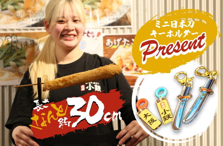 全長30センチを超える『名刀小鉄串』は、日本の刀をモチーフにしたインパクト抜群の名物串カツ。テーブルに運ばれた瞬間に視線を集め、写真を撮りたくなる一本です。さらにミニ日本刀キーホルダー付きで、食事のあとも旅の記念としてお持ち帰りいただけます。ボリュームもあり、仲間とシェアして楽しめる、日本の食とカルチャーを味わえる串カツです。